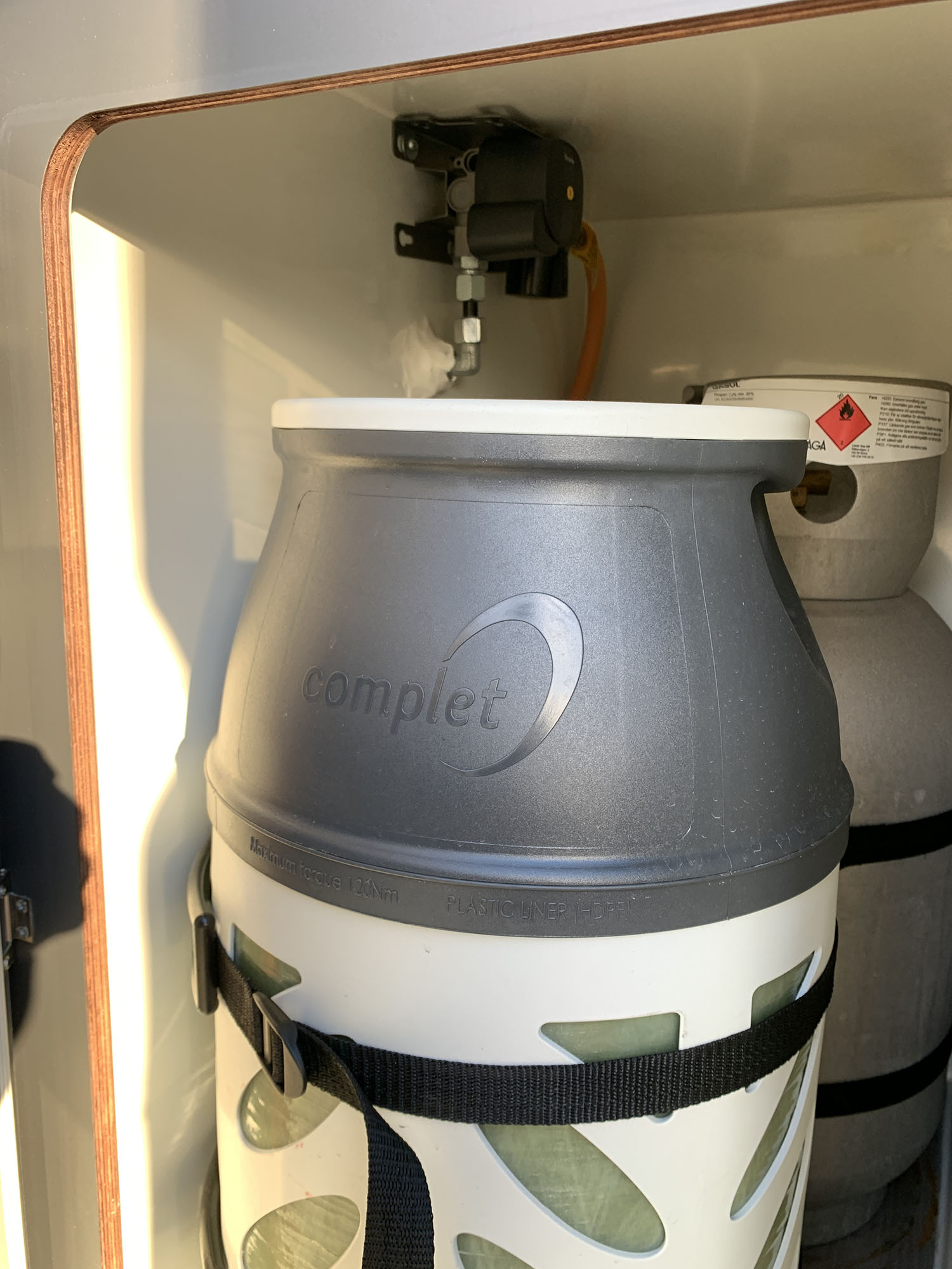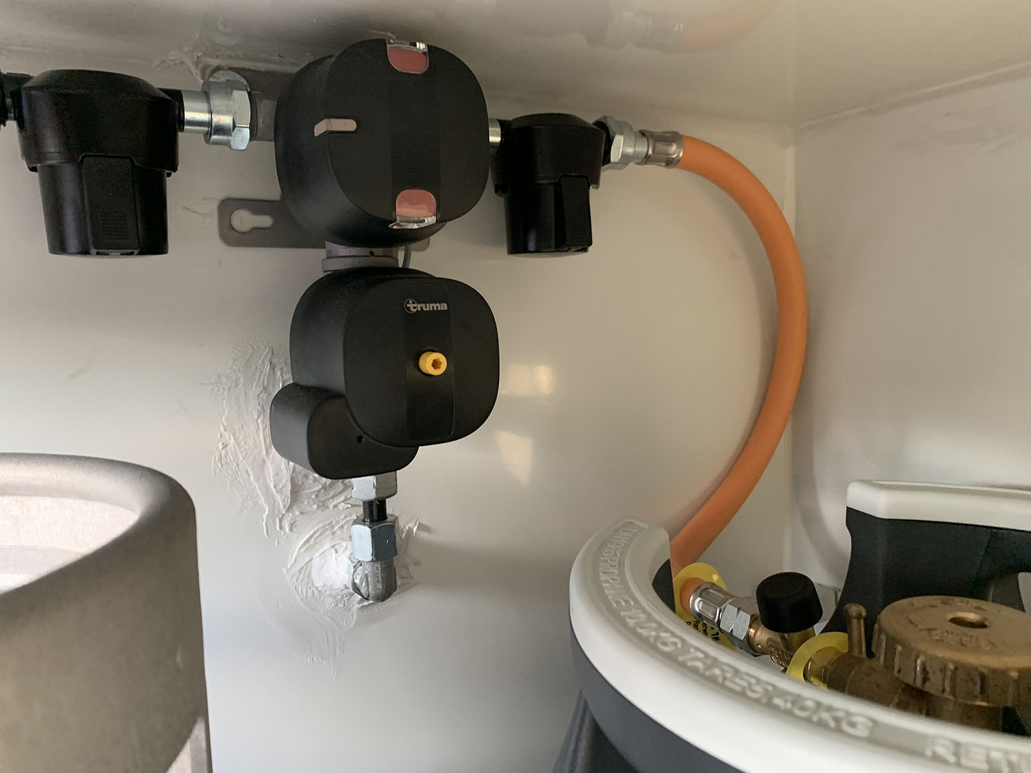 Wir haben ein Duo-Matic-Gassystem mit einem Crash-Sensor und automatischer Umschaltung zwischen zwei Flaschen. Wir können sehen, wenn die Hauptflasche leer ist, und das System schaltet auf die Reserveflasche um. Auf diese Weise vermeiden wir, mitten in der Nacht Gasflaschen zu wechseln. Ein Crash-Sensor unterbricht die Gaszufuhr bei einer Kollision oder einem Aufprall und ist mit EisEx ausgestattet, um ein Einfrieren des Reglers im Winter zu verhindern.
