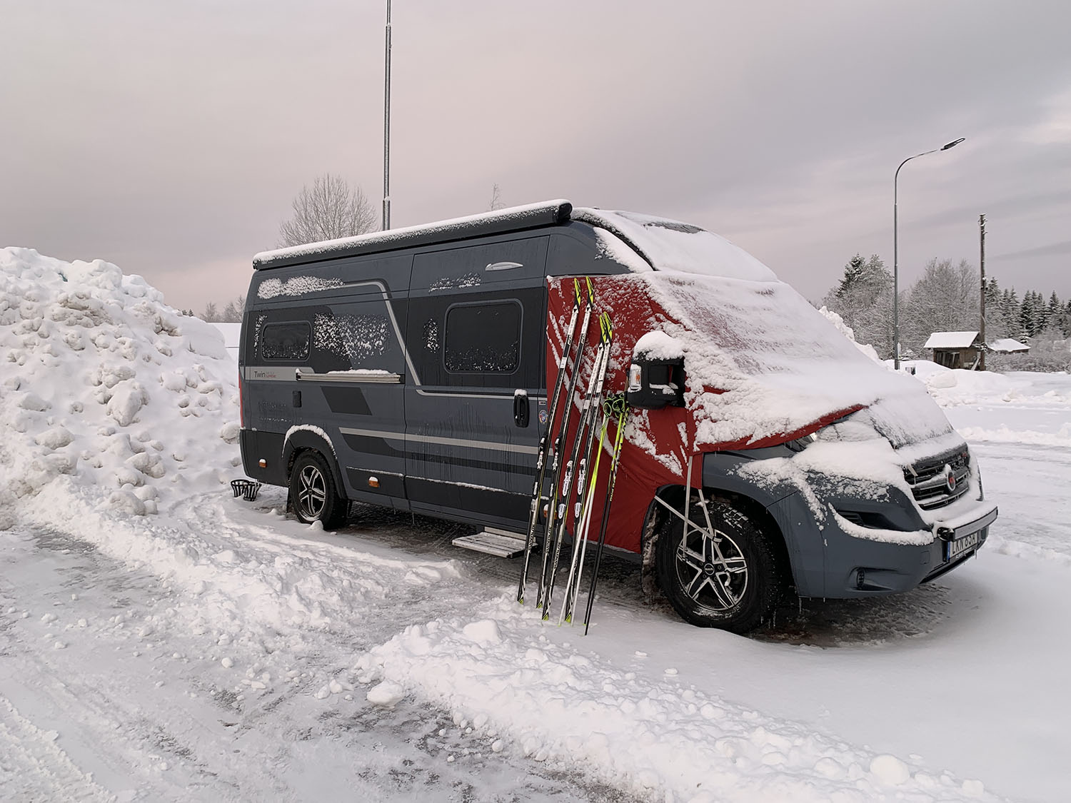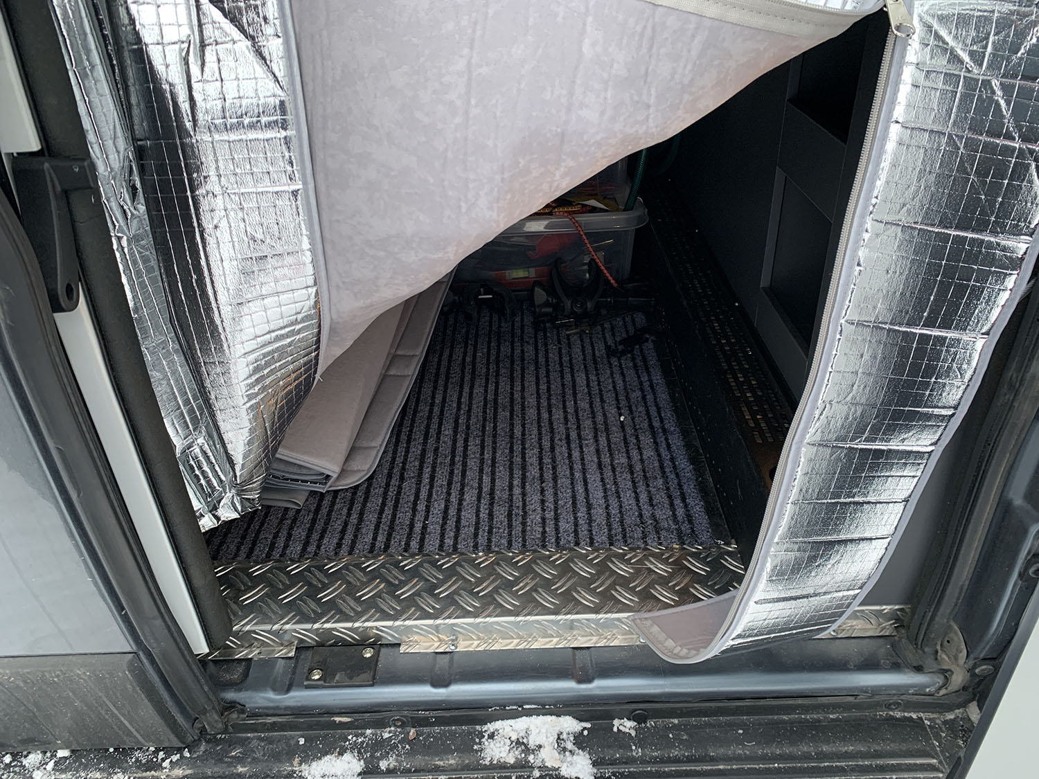 Nicht nur der vordere Boden trägt stark zu Zugluft bei, sondern auch die Türen, die Windschutzscheibe und die Seitenfenster. Seit mehreren Jahren testen wir verschiedene Modelle, sowohl für den Innen- als auch für den Außenbereich. Wir finden jedoch, dass die Decke von MASA die beste und einfachste Lösung ist; sie lässt sich schnell anbringen und wieder verstauen. Wir haben auch eine Innenisolierung ausprobiert, aber da sich an der Innenseite der Fenster Kondenswasser bildet, bevorzugen wir das Außenmodell. Wenn Sie die Möglichkeit haben möchten, die Tür zu öffnen und nach draußen zu sehen, während Sie die Wintersonne hereinlassen, gibt es auch ein Modell mit einer Öffnung. Die MASA-Decke eignet sich nicht nur im Winter, sondern auch im Sommer, da die silberne Oberfläche dazu dient, die Wärme abzuhalten.