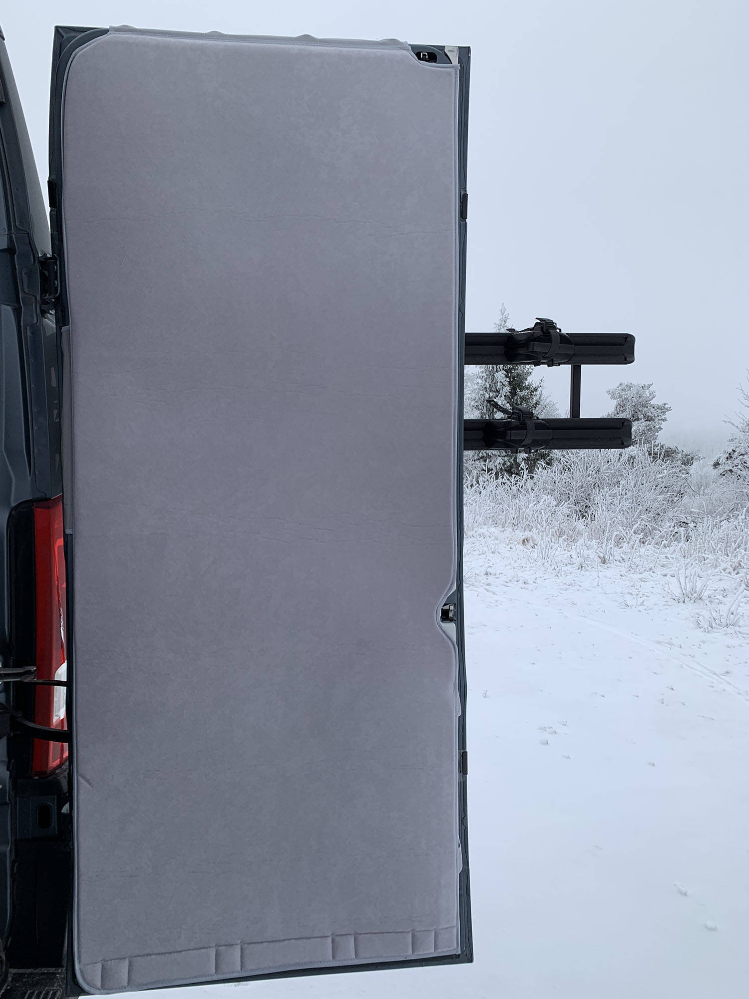 Mit dem Kopf direkt in Richtung einer kalten Tür zu schlafen … wir haben schnell gemerkt, dass das nicht besonders gemütlich ist. Wir haben zwei verschiedene Modelle zur Isolierung der hinteren Türen getestet. Beide Modelle haben Vor- und Nachteile, je nach Vorlieben und Nutzung des Wohnmobils.