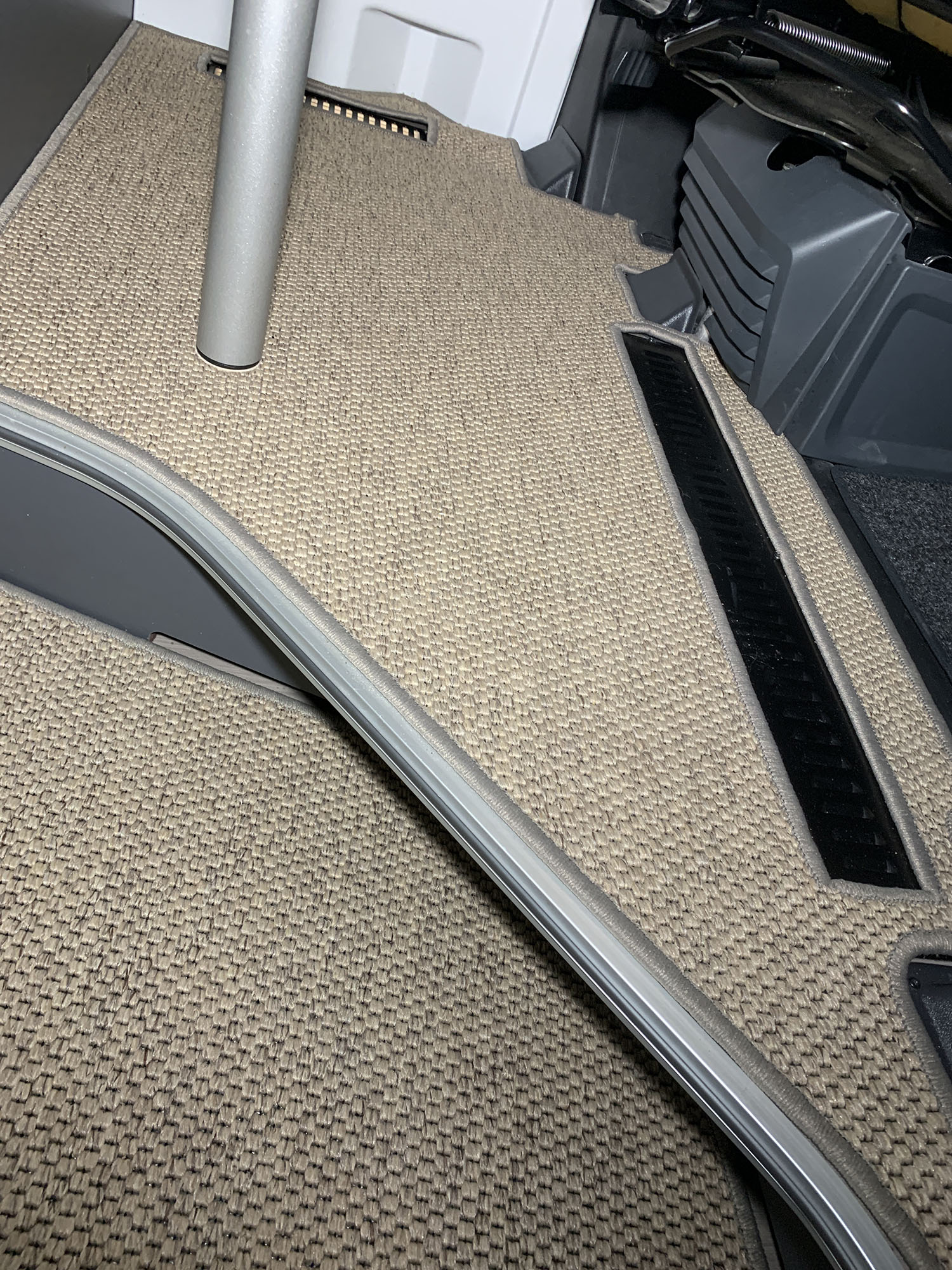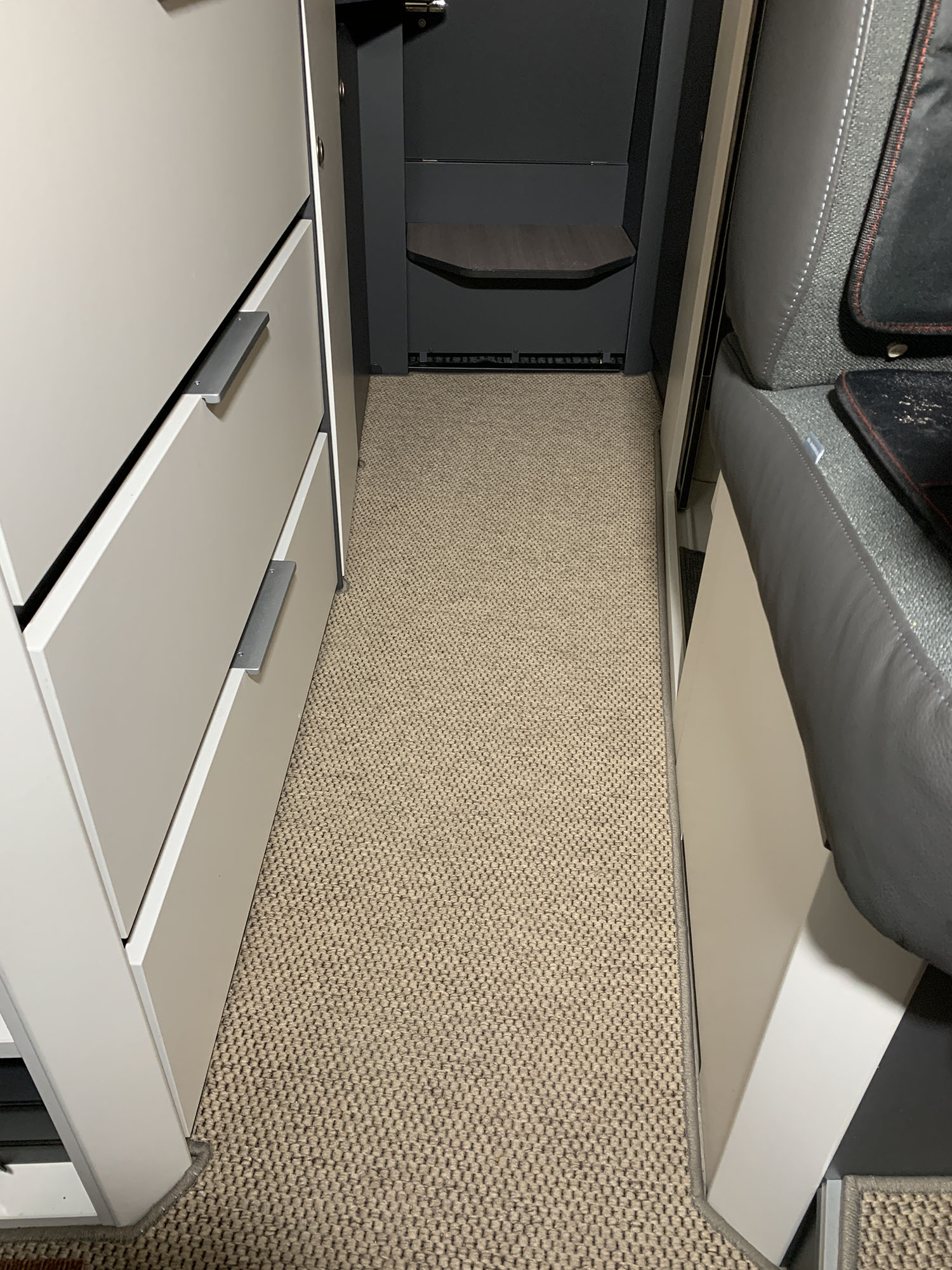 Stilvolle Teppiche im Wohnmobil sind genauso selbstverständlich und wichtig wie zu Hause. Da wir in unserem Wohnmobil eine Fußbodenheizung haben, ist es wichtig, einen Teppich zu wählen, der nicht zu dicht ist und keine gummierte Unterseite hat, um zu verhindern, dass die Wärme nach oben steigt und der Teppich Spuren auf dem Boden hinterlässt. Eine maßgeschneiderte Matte sorgt für einen gepflegten und gemütlichen Eindruck und hat zudem schalldämpfende Eigenschaften. Es gibt viele verschiedene Teppichmodelle, und wir haben uns für eines entschieden, das sowohl vom Stil als auch von der Farbe her zu uns passt.
