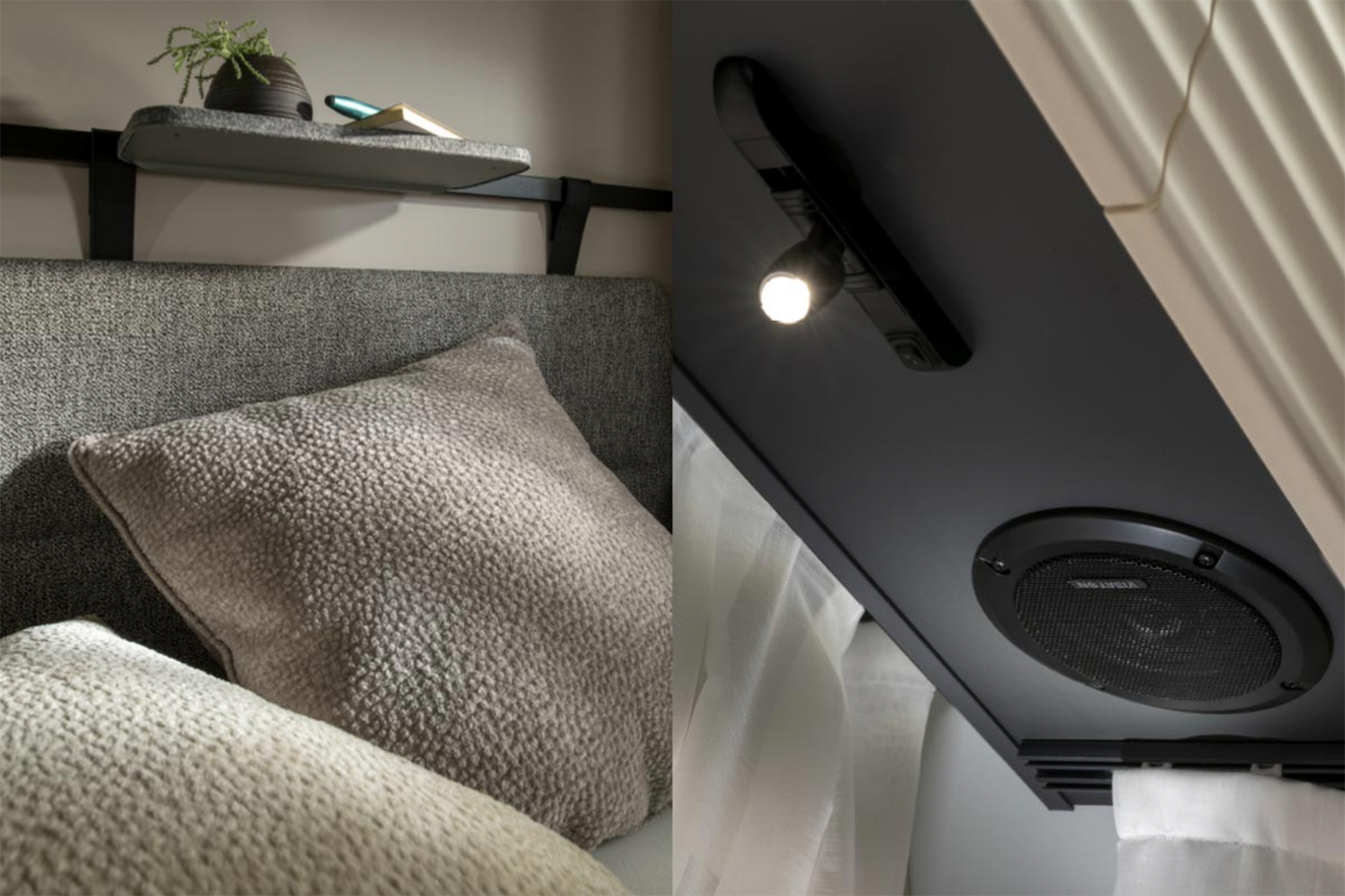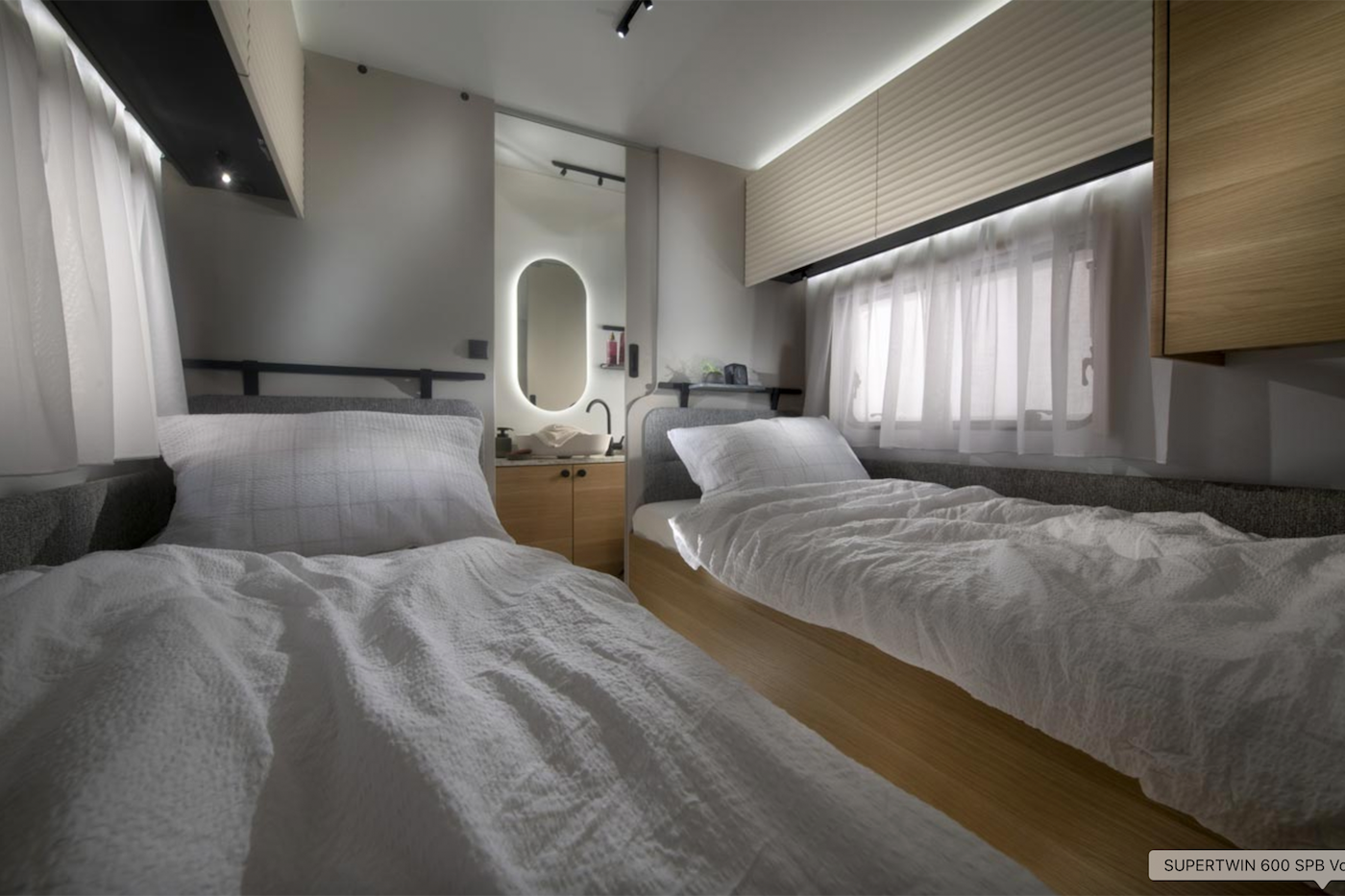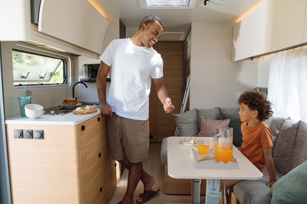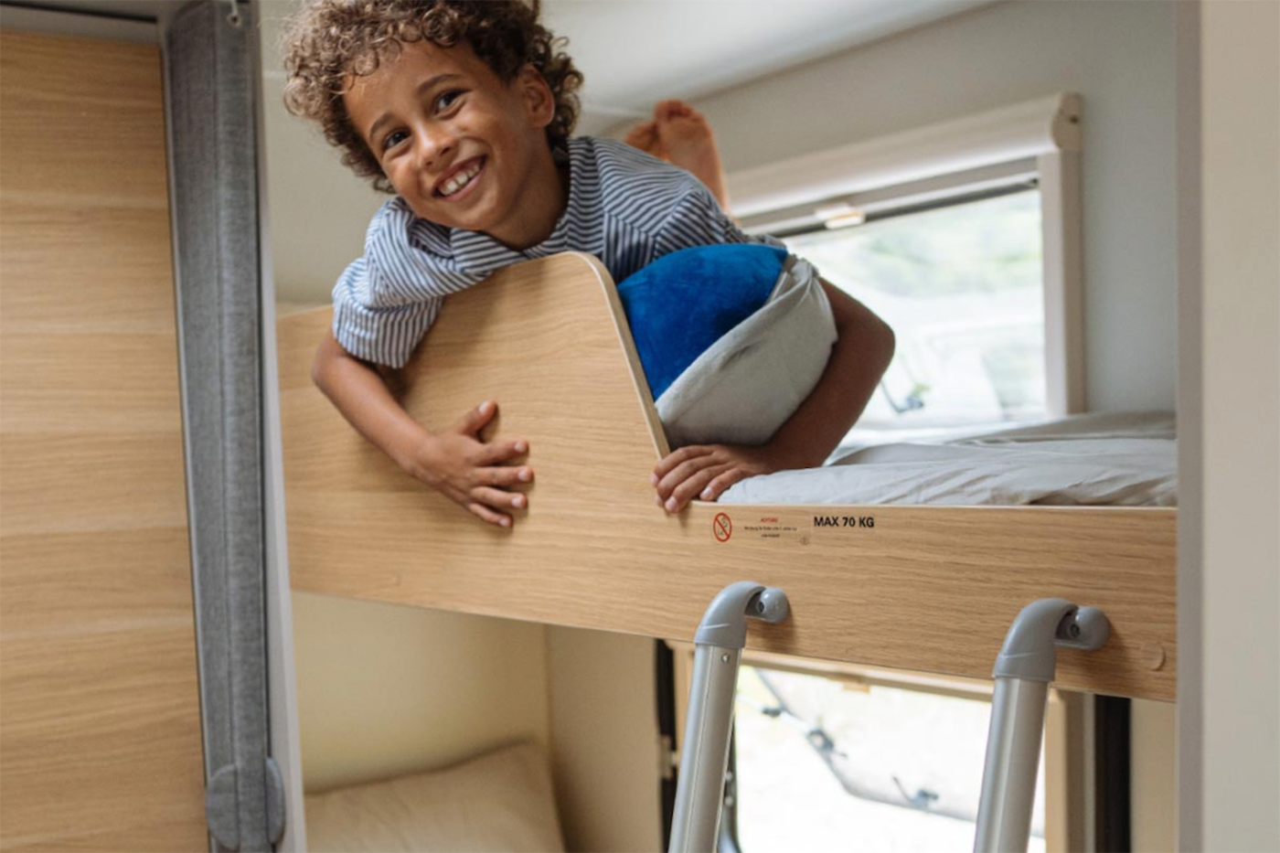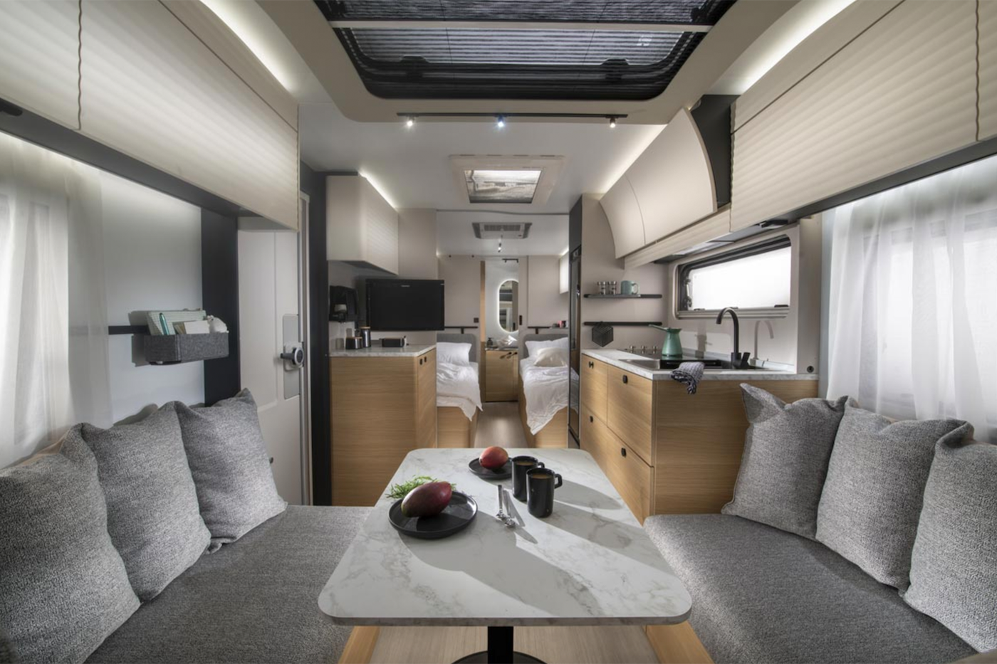 In jedem Wohnbereich finden Sie entspannten Komfort. Küche und Bad sind neu gestaltet, mit Arbeitsflächen im Marmorlook und schwarzen Accessoires. Die Sitzbereiche sind verbessert, mit teilweise beweglichen Rückenstützen im Sitzgruppenbereich. Es gibt neue Schränke und einen Dinettentisch im Marmorlook. Die Schlafzimmer bieten höherliegende, leicht zugängliche Betten mit neuen Kopfstützen und Evopore®-Matratzen – sogar bei den Etagenbetten. Stauraum ist gut organisiert, mit cleveren Lösungen in allen Bereichen. Für den Ganzjahreseinsatz gibt es eine verbesserte Isolierung, Heizsysteme von Truma und Alde sowie ein Luftzirkulationssystem für die optimale Wärmeverteilung. Optional ist auch eine Klimaanlage verfügbar.
