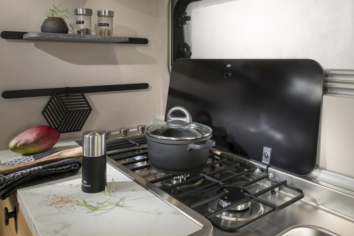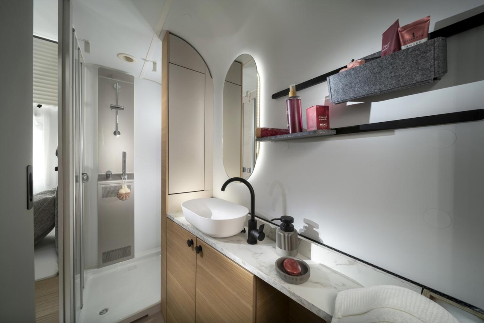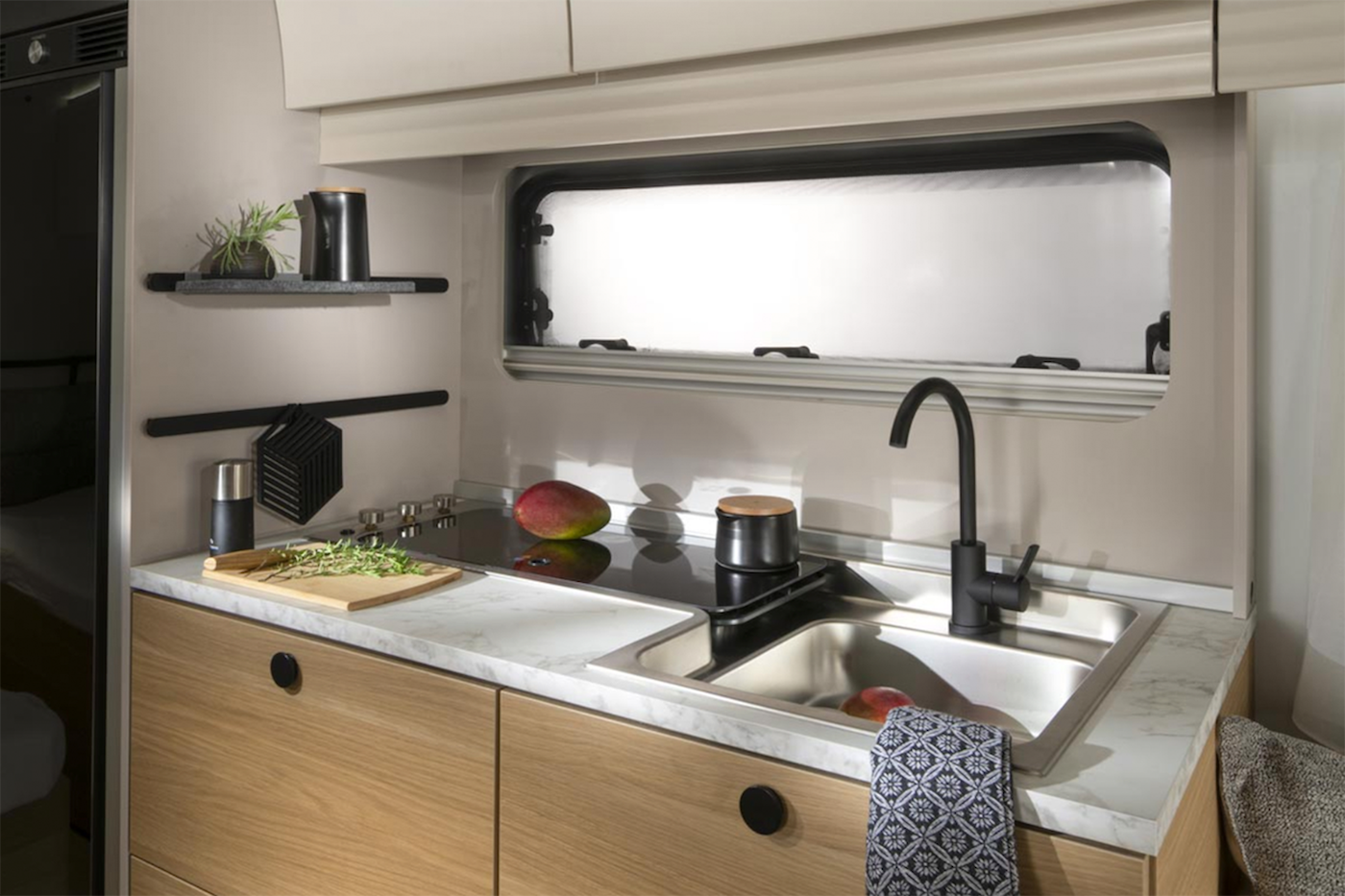 Die Küche ist aufgewertet mit Kochfeld, 157-l-Kompressorkühlschrank, push-lock Schubladen mit viel Platz, Arbeitsplatte im Marmorlook, alles schön akzentuiert durch schwarze Armaturen und Details. Das Bad bietet mehr Raum, mit Thetford-Toilette, großem Waschbecken mit schwarzer Armatur auf einer Arbeitsfläche im Marmorlook, neuem beleuchteten Spiegel und Stauraum sowie einer Alde-Duschsäule.