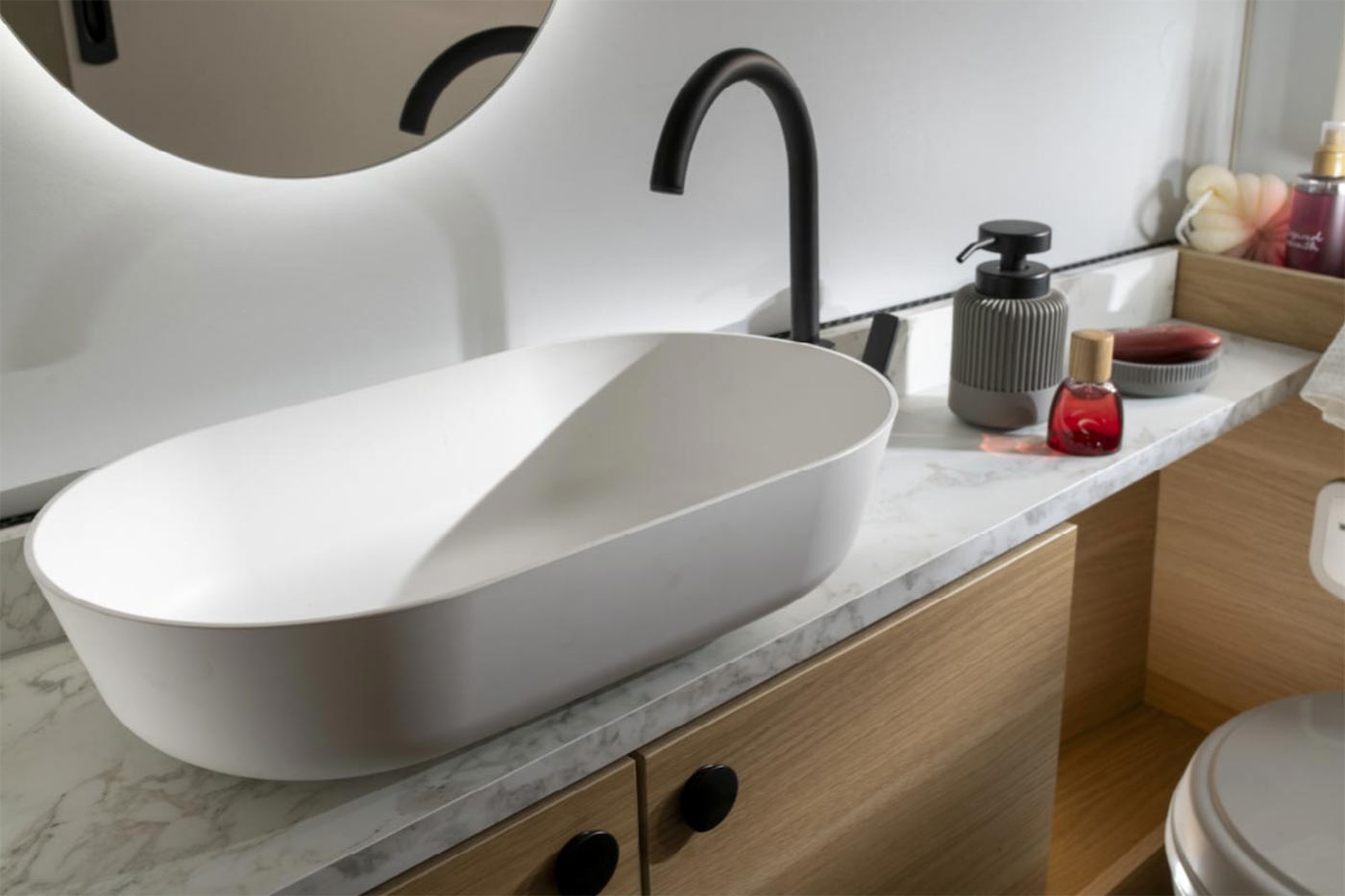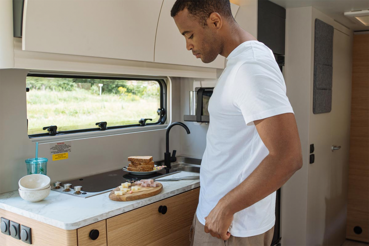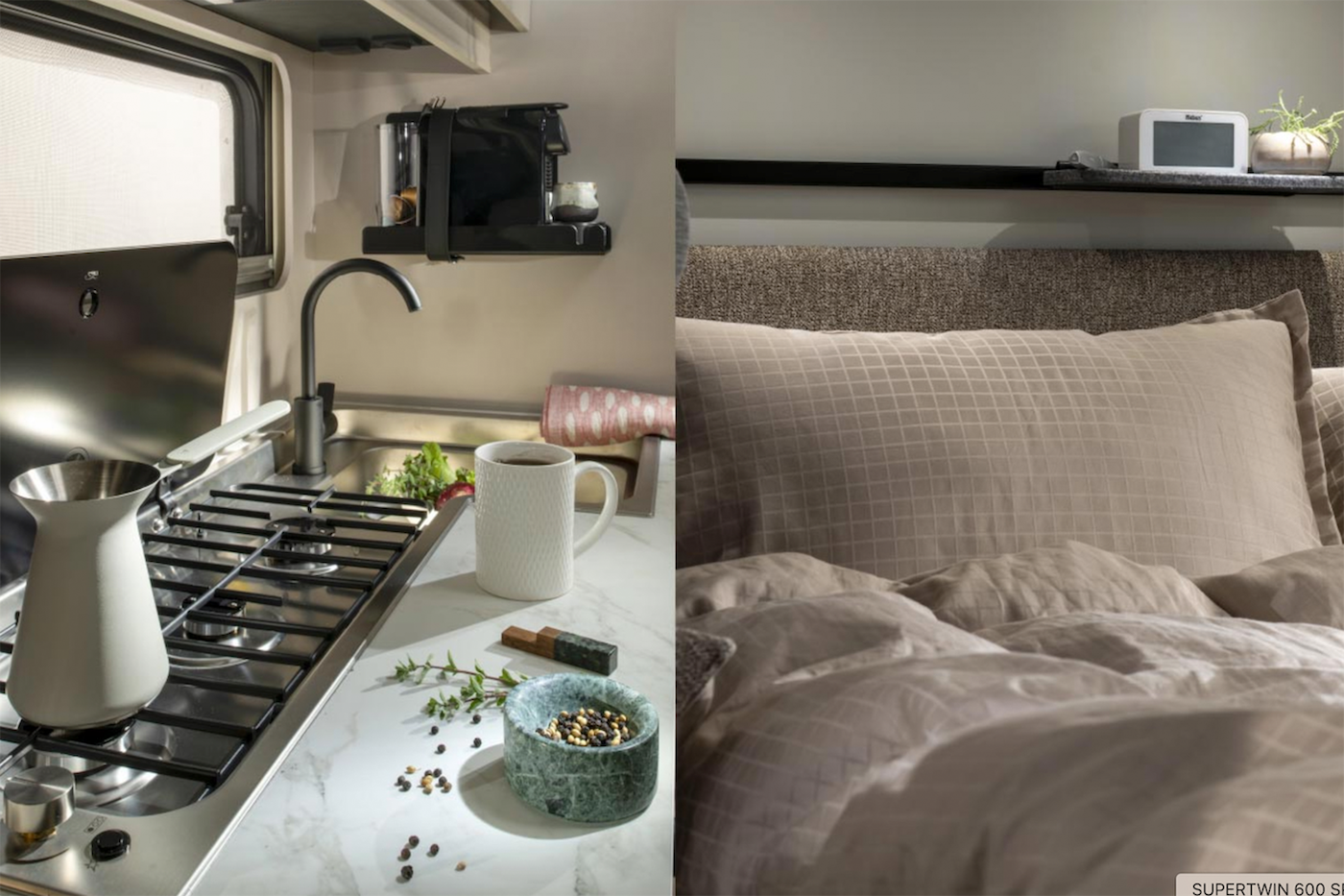 Die Küche ist aufgewertet mit Kochfeld, 157-l-Kompressorkühlschrank, push-lock Schubladen mit viel Platz, Arbeitsplatte im Marmorlook, alles schön akzentuiert durch schwarze Armaturen und Details. Das Bad bietet mehr Raum, mit Thetford-Toilette, großem Waschbecken mit schwarzer Armatur auf einer Arbeitsfläche im Marmorlook, neuem beleuchteten Spiegel und Stauraum sowie einer Alde-Duschsäule.